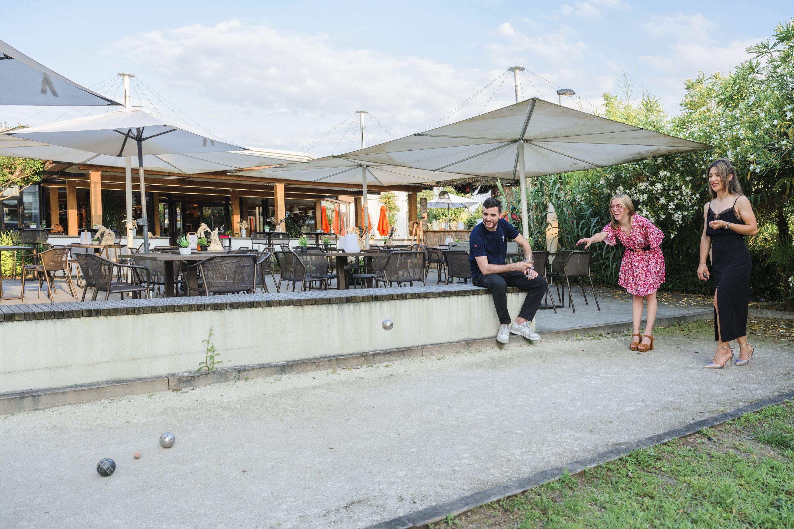 Une grande terrasse privatisable avec bar extérieur et terrain de pétanque qui fait le bonheur de nos clients aux beaux jours.